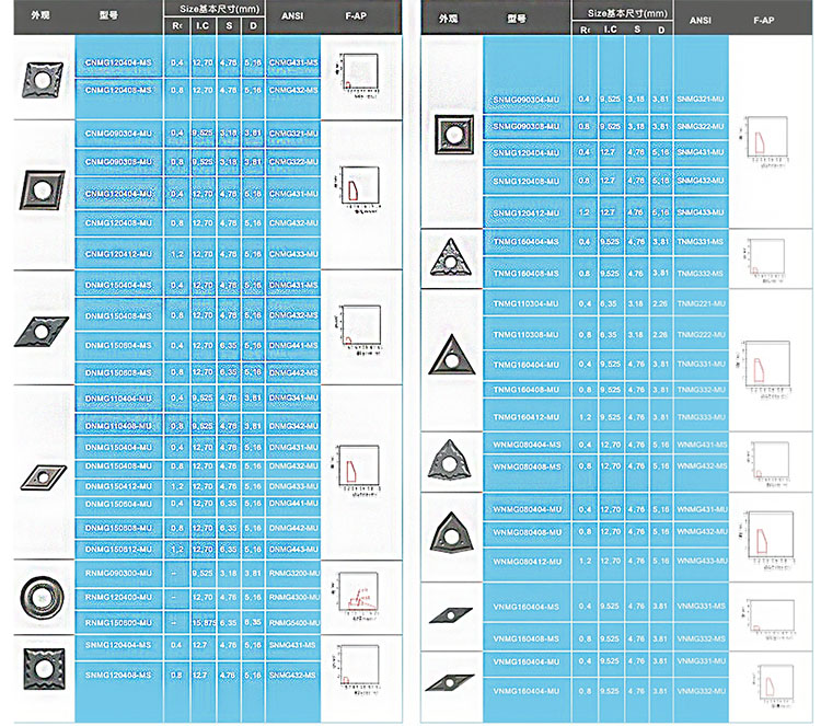 目前我們提供的刀片有常用的C型,D型,R型,S型,T型,V型,W型等幾種負(fù)角刀片。